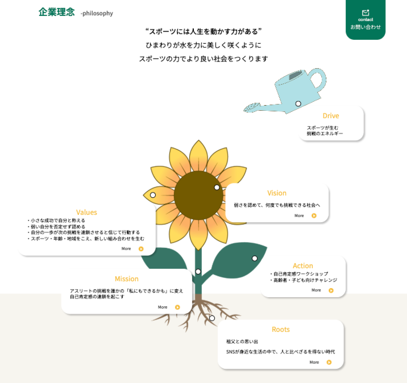 企業理念をしっかりと伝えるため、そしてファンになってもらうため、特に力を入れました。理念、という堅苦しいイメージを払拭するため、イラストを用いました。ジョウロから出る水をスポールの力とし、綺麗なひまわりを咲かせる、すなわちより良い社会が広がっていく源に見立てました。