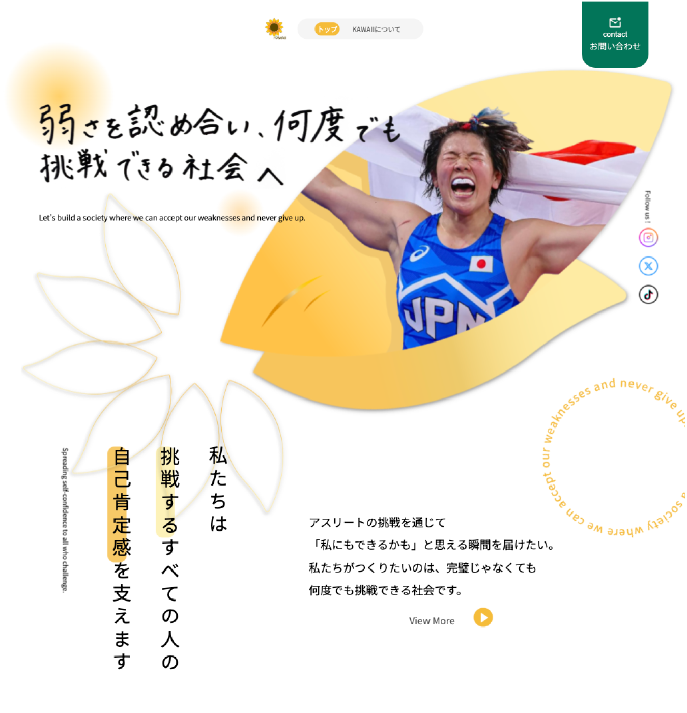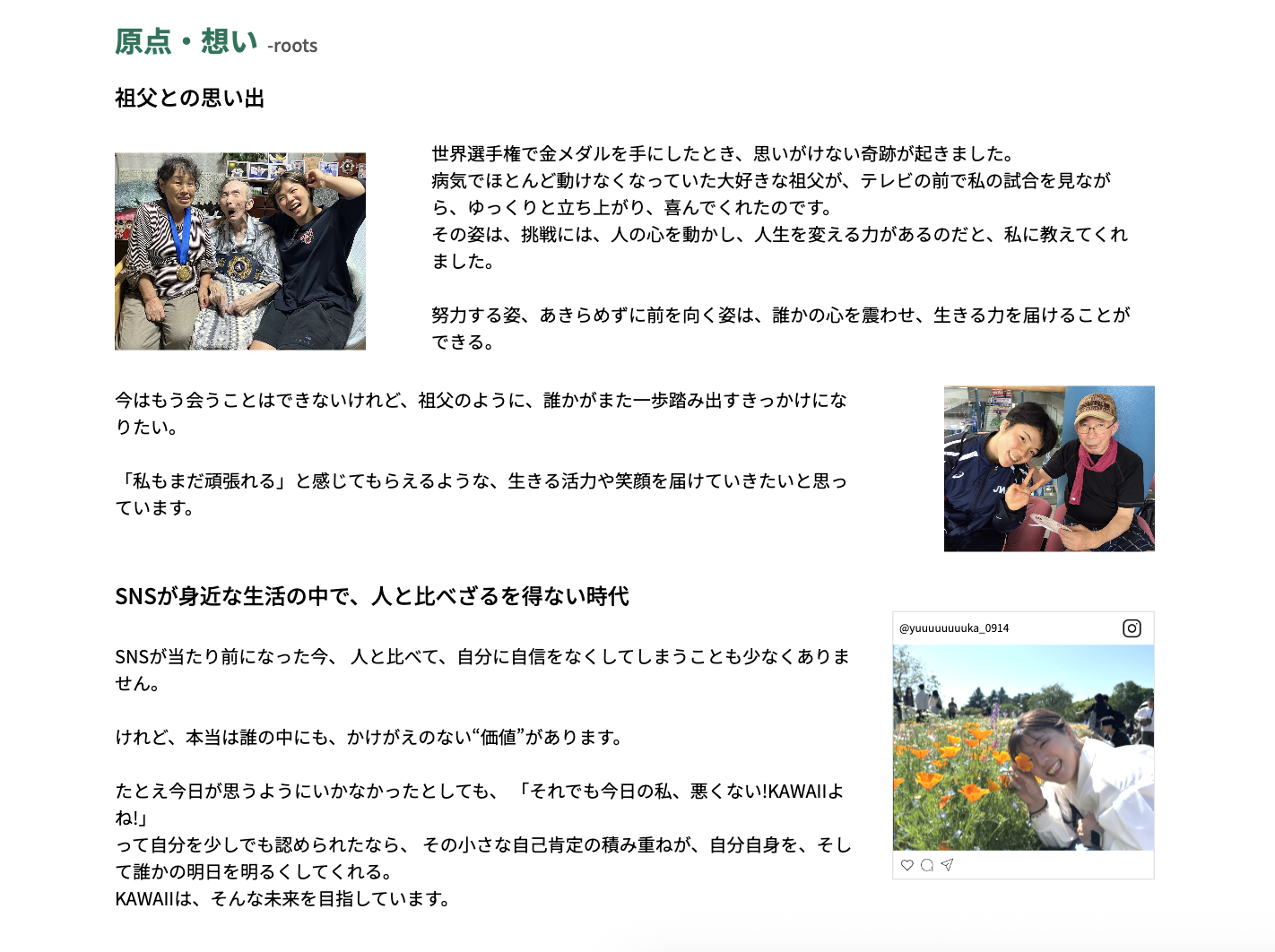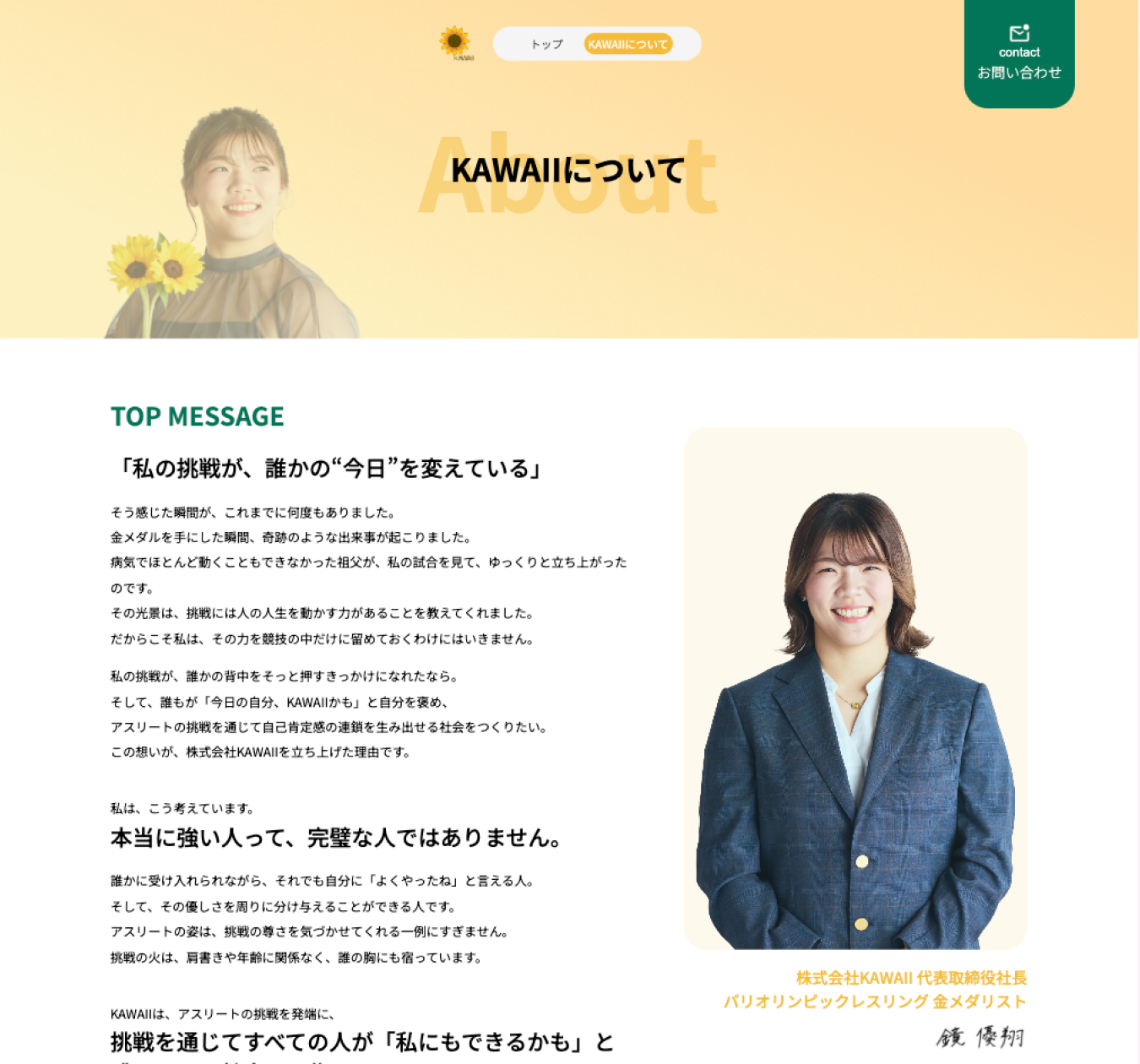 - パリオリンピックレスリング金メダリスト、鏡優翔選手が代表を務める株式会社KAWAII様のコーポレートサイト。企業理念や方針を発信するだけでなく、各事業の情報発信や、ファン・メディア・スポンサーへのブランド理解促進を目的として、サイトを立ち上げました。